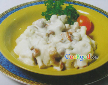 2、再加入用水焯过的蘑菇,并放入奶汁、盐、胡椒粉调味,用小火煮熟后即可装盘。