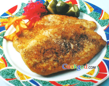 3、煎盘放橄榄油烧热,放腌好的鸡脯煎至熟透装盘,盘边配炸土豆条、渍紫菜、酸黄瓜等菜码即可。