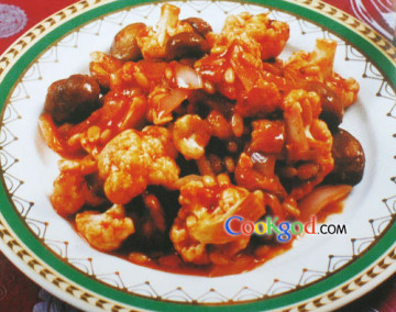 2、再加入菜花、红酒、松子、口蘑、番茄沙司、盐、胡椒粉等调味,烧开后小火至成熟即可装盘。