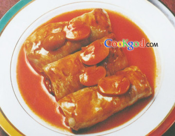1、把卷心菜叶煮熟后,包上用盐、鸡蛋、胡椒粉、俄力冈、圆葱碎、西芹碎调制好的猪肉馅卷成卷,放入煎盘中煎两面上色备用。