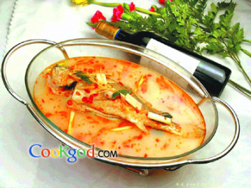 4、锅烧热,下泰国辣椒膏、姜条、鲜菇、香茅、南姜、番茄仔、香芹、泰椒小火炒香,下二汤、花奶、椰汁、柠檬汁、辣椒油和黄花鱼小火煮5分钟,用剩余的盐、白糖调味,小火煮滚至鱼熟便可上盆。