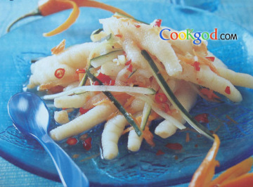 (1)鸡脚去甲,用盐水烧20分钟,取出浸入冷开水后去骨。