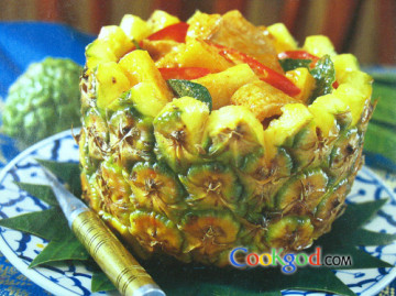 菠萝1/2个,猪肉200克,红辣椒1只,柠檬叶2片。调味料:红咖喱酱2汤匙(见19页),椰奶2罐(820克),椰糖2汤匙,鱼露3汤匙。