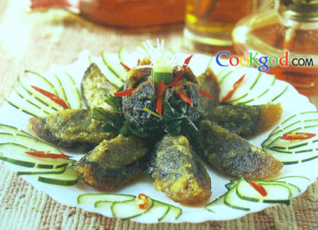(3)甲抛叶洗净,沥干,入油锅以大火炸至脆身,撒在皮蛋上。