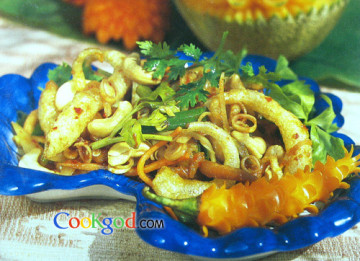 (1)鸡肉洗净,切丝,拌上生粉,以大火油炸至熟而干身。