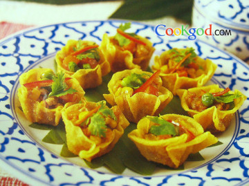 1.泰国的很多炒菜里都喜欢用香菜头,原因是它的香味非常浓郁. 2.金杯里的馅料可以自由变化,没有做不到,只有想不到,呵呵. 3.因为有了生抽和蚝油,所以不需要另外再加盐了.