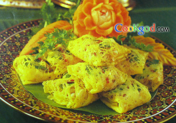 (3)蛋皮上放上1根红椒丝,再加上片薄荷叶,舀上l~2茶匙馅料,包成方包型,翻身置于盘中即可。