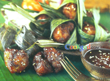 3.)把作法2完成的鸡腿肉包在粽叶里成肉粽状,用牙签固定,入油锅以60∼70℃油温泡至熟,再转大火至80℃,让油逼出,沥干油份后,即可盛盘上桌食用。