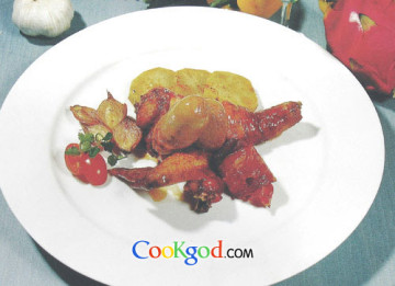 烤制时,根据材料的性质和大小分别从烤箱内取出保温,待仔鸡熟后一同装盆。