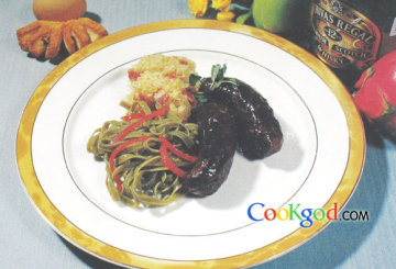 (3)面条用滚水煮软,用黄油加蒜泥将面条翻炒并加盐、胡椒调味。