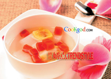 (2)琼脂加水浸软,加1250毫升水煮沸后放入冰糖,文火熬煮20分钟,下牛奶、香蕉片,煮沸后关火。