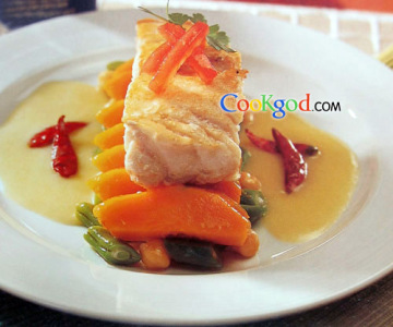 鱼柳(石斑鱼)360克,白酒100毫升,红辣椒干少许,淇淋100毫升,冻牛油粒20克,鱼上汤100毫升,蒜茸2粒,洋葱粒2汤匙,盐及胡椒粉适量。
