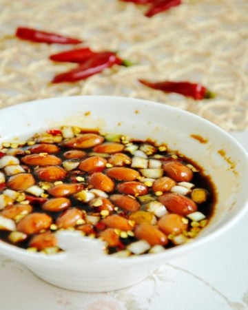 3。倒入花生米,淋麻油,花生米浸泡入味即可