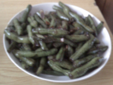 3.煎培根的油不要倒掉,用来炒扁豆,如果不够可以加点色拉油.烧热油,放扁豆进去煸炒,然后放少许水煮两三分钟至扁豆熟透