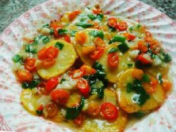 3.将炒锅内余油倒出,锅内留少许油,放入葱蒜炝锅,加盐、白糖和少许水,开锅后用水淀粉勾芡,撒上青红椒。加味精、香油炒匀,浇在盘中炸土豆片,撒上胡椒粉即可上桌供食。