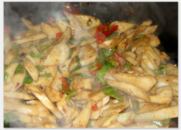 2.油锅热后,略煸蒜末、干辣椒,下尖椒、藕丁翻炒,加盐,少许米醋、胡椒粉、鸡精,炒匀片刻即起锅(中间若太干,应稍点水,保证藕丁色泽洁白)。
