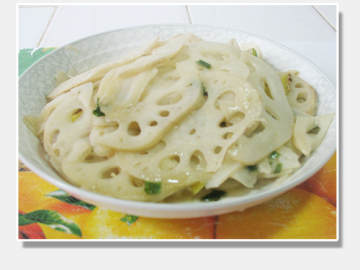 3、将藕片盛碗里,加盐、糖、白醋、味精(不喜欢味精的可不放),把锅中炸好的辣椒连油趁热均匀地淋入藕片上,立即加盖焖约五分钟。
