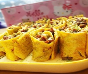 1.可以加少许牛奶,成品看起来会嫩黄嫩黄的,但是不能加多,否则就不容易成型了。 2.要开小火煎,不然容易熟,卷不紧。我卷得就有点松了,可以再紧点~ 3.如果不喜欢葱的话也可以不放葱花,我觉得放葱花会香点,也好吃。
