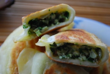 2、烫面,擀皮,包入馅料,入锅煎好即可。