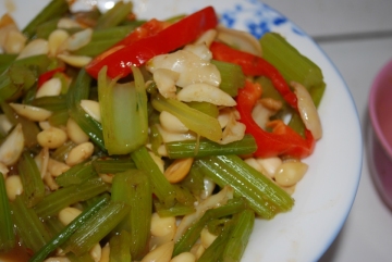 3、先炒西芹,再放百合、杏仁,最后加盐调味就可以了。