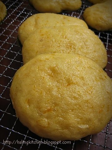 2) 将面粉,糯米粉,幼糖,金瓜泥和酵母粉倒进大盆,慢慢加入清水和油,用手搓至面团