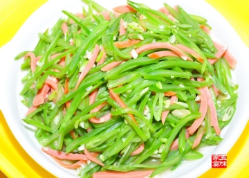 1:芸豆摘去豆筋洗净切丝 烤肠切丝 蒜(3瓣)剁成蒜末