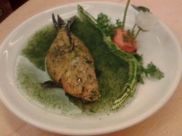 整鱼去骨;嵌入山珍;肉末,糯米,炸熟淋南瓜叶羹即可.