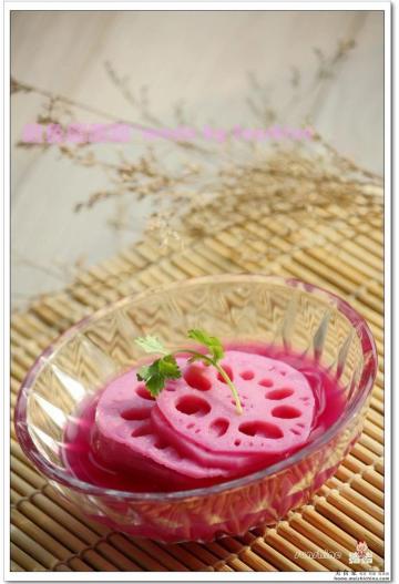 5、最后把藕片泡在紫甘蓝汁中就ok了,用盖子盖上或者用保鲜膜封好放在冰箱里,我做的这个泡的时间比较长,有四个小时了,所以颜色也比较深,如果不喜欢这么深的颜色泡一个小时就可以了。但如果要藕片进味时间还是要长些才行哦。口感脆脆的,味道呢,就是酸酸甜甜的啦!