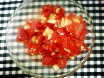2 如果喜欢辣的就不要去掉辣椒里面的白色筋膜,切成碎块,不要过于小,太小了,一腌制口感不好,过于疲软。