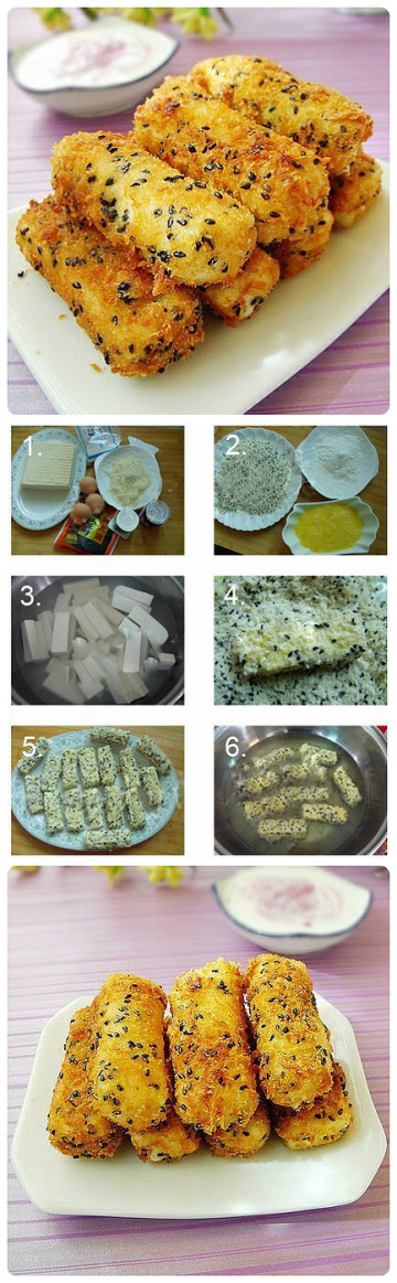 1,面包糠黑芝麻混合拌匀,鸡蛋三个,一个全蛋,两个用黄去蛋清,充分搅拌均匀。(这样炸出的金条比较黄,要是自己家吃,就别这么浪费,都用吧,两个鸡蛋就够了)