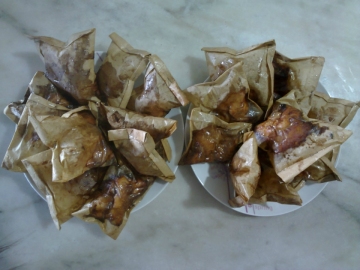 (3)油烧熟,放入纸包鸡大火炸2分钟,见鸡浮起后,用漏勺压一压立即捞出。纸包鸡内亦可加些香菰丝或辣椒丝。