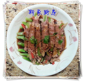 2、将以上材料分成12份,分别用肥牛片卷紧;