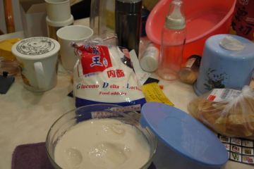 4、在豆浆温度稍稍降为摄氏85度左右(约华氏185度左右)时,将装豆浆的容器稍微提起至高处,往装有均匀石膏粉浆的深盆里冲。