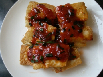 3,锅内留少许油,放切碎的葱花或蒜苗,适量蕃茄酱,稍炒一下煎好的豆腐上即可