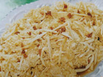 色泽金黄,细如金丝的冬笋丝与鸡茸融为一体,笋嫩脆,鸡茸松软,鲜润爽口,芳香扑鼻 .