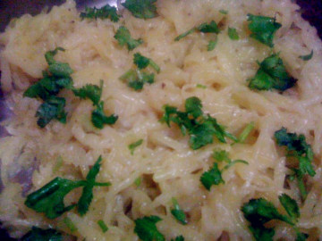 1.土豆去皮、擦成丝,蒜、小红辣椒切碎,香菜、葱切段