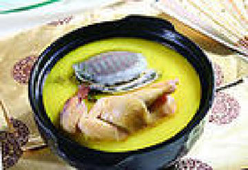 3. 取大砂锅,放入锅垫,上放口蘑、盐笋,把裙边呈圆形摆匀,再把鸡条摆在上面。用肘子肉围住鳖裙。入套汤、酱油、料酒、盐。