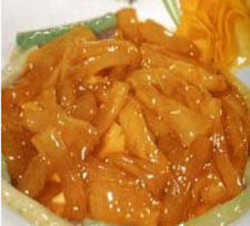 3、将压好的牛筋取出,切成长薄片后装入盘中,随特制的麻辣椒盐一起上桌即可。