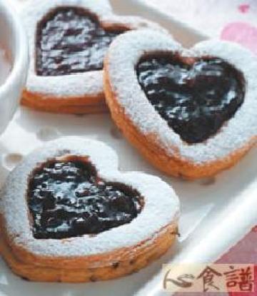 6.取1片空心心形饼干放置在大片的心形饼干上面,撒上糖粉作为装饰后,再于饼干心形空心处填入覆盆子果酱,以此作法将剩余的饼干完成即可。