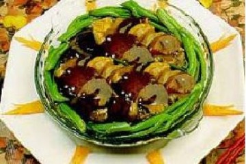 ③将冬菇泡软后,剪下菇蒂,用1杯清汤加油、酱油各l汤匙及糖、葱、姜少许上锅蒸15分钟,滤出排列在中间。