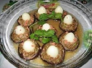 4.把鹌鹑蛋放在香菇的中间,周围把做好的馅酿在香菇上。