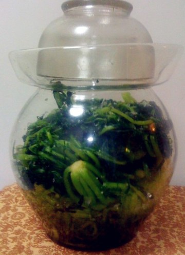 6.再次将水攥一攥,装坛,将剩余的盐和水烧开,凉后倒入,水没过雪菜。如果家有石头啥的最好,压在雪菜上面。