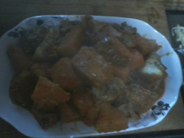 火腩八两、南瓜二斤、姜、蒜、鸡粉、白糖少许、蚝油一汤匙、柱侯酱一汤匙、水半斤