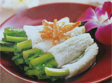 1、椿菜切去大叶部,留梗,竹荪用高汤煨软。