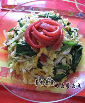 1.白菜取白菜芯切丝,肘子肉切丝,摊好的鸡蛋皮切丝,粉丝用开水烫软捞出,菠菜切段,放进开水焯一下,捞出。山楂糕和梨均切成丝,香菜用热水烫一下,切末,蒜剁成蒜泥