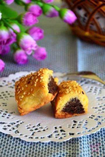 高筋面粉150克,黄油80克,糖粉40克,鸡蛋20克,枣泥馅250克,全蛋液,芝麻,