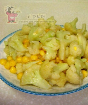 把菜花用手掰成小朵,用沸水烫熟,自然冷却备用。玉米粒煮熟。鸡脯肉切成小丁(同菜花大小),用湿淀粉、鸡蛋清上好浆。炒锅加油烧热后,放入鸡丁用油滑一下后捞出。锅内留少许油,烧至六成热时把菜花、玉米、鸡丁放入一同煸炒,放入少许鲜汤,加精盐、味精,勾米汤芡即可。