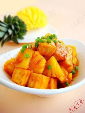 豆腐约300克、菠萝约130克、、葱段、姜片、蒜、盐、番茄酱3tbs、白糖、生粉水约1/2杯、醋1小匙。