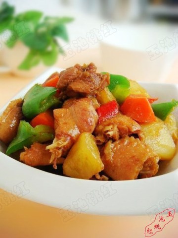 1.把鸡切成小块儿。土豆、胡萝卜、青红椒切块,把各种料备好