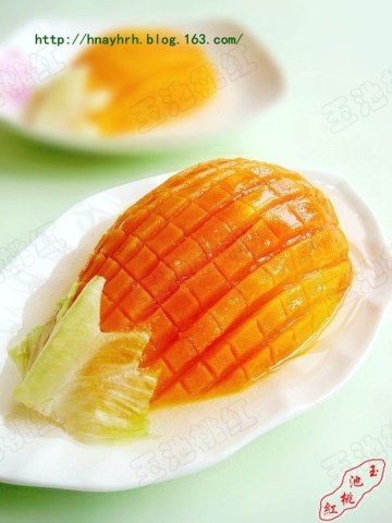 5.出锅后烧上蜂蜜和白糖兑好的汁水,如果有橙汁的浇上去更漂亮也更好吃,我家里没有,就烧了蜂蜜白糖汁,用生菜叶子梗剪出叶子的形状,放在木瓜的一端即可